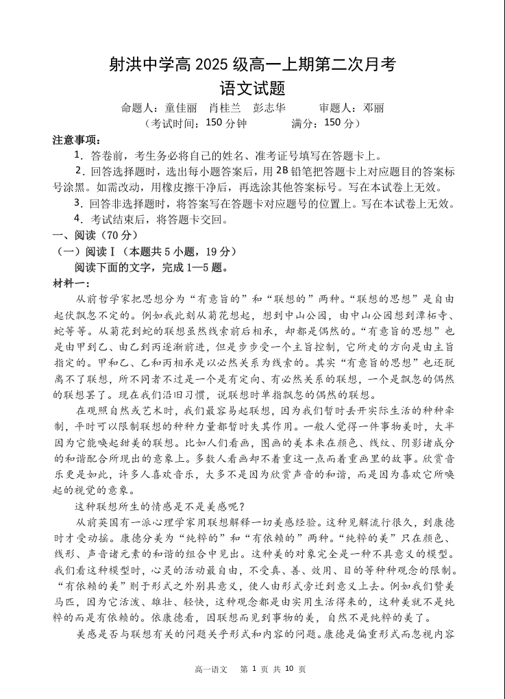 高一语文--四川省遂宁市射洪中学2025-2026学年高一上学期12月月考
