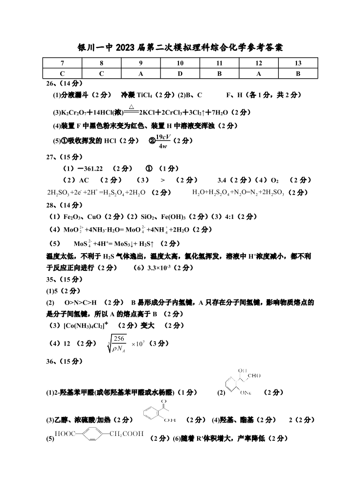 高三理综化学答案--宁夏回族自治区银川一中2023届高三下学期第二次模拟考试