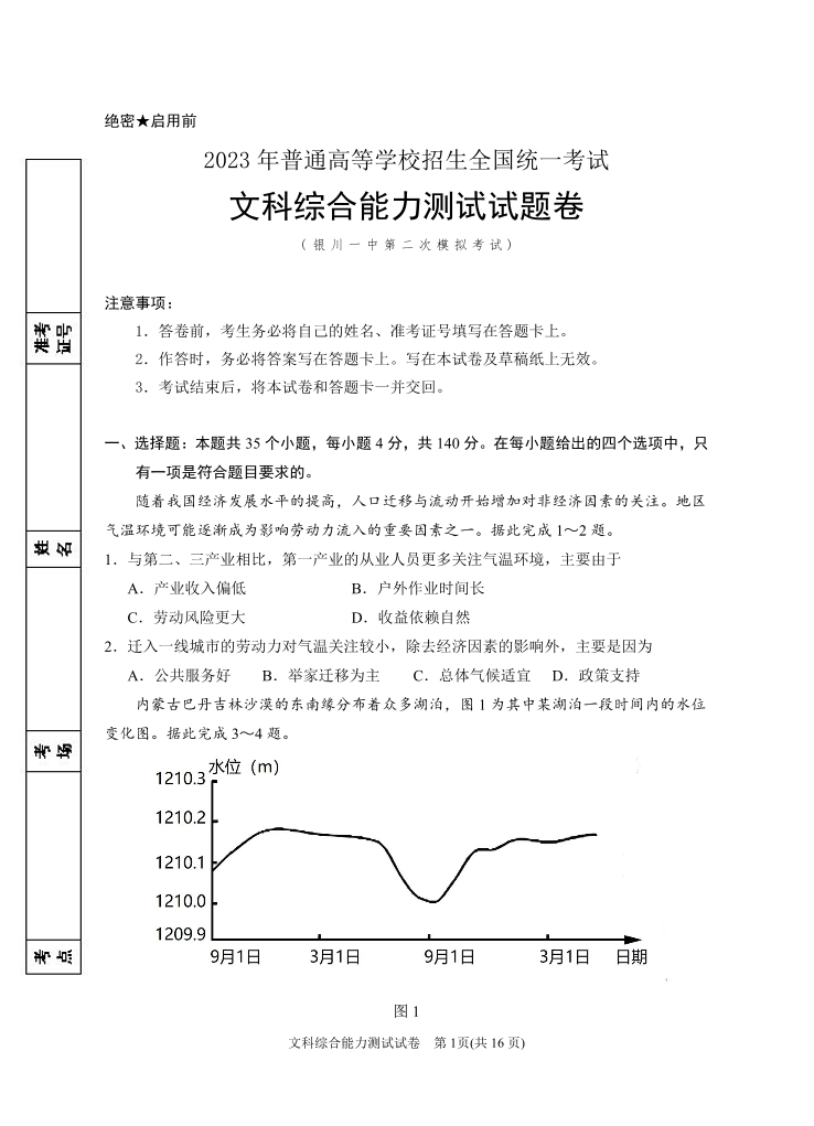 高三文综--宁夏回族自治区银川一中2023届高三下学期第二次模拟考试