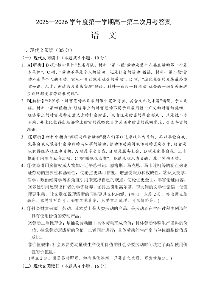 高一语文答案--海南省文昌中学2025-2026学年高一上学期第二次月考