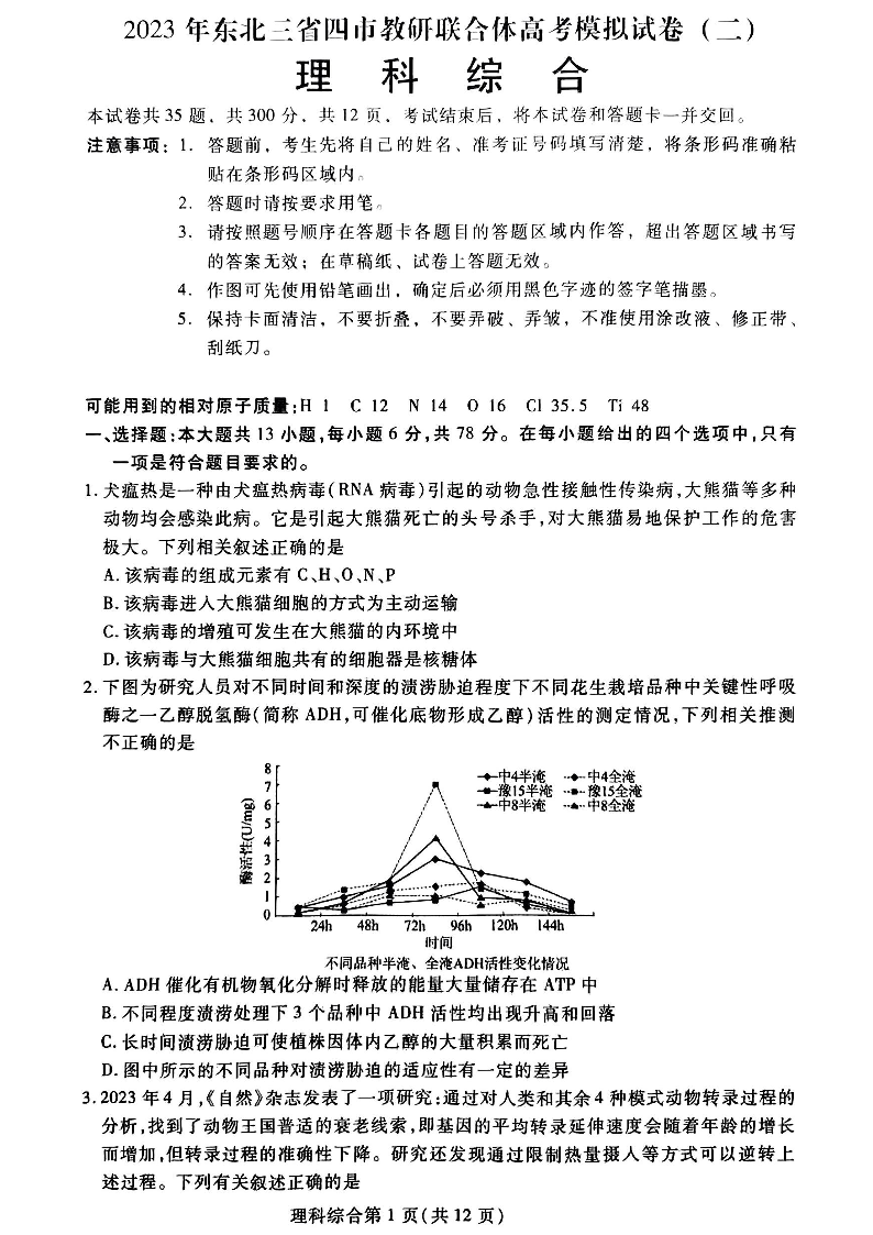 高三理综--东北三省四市教研联合体2023届高考模拟考试(二)