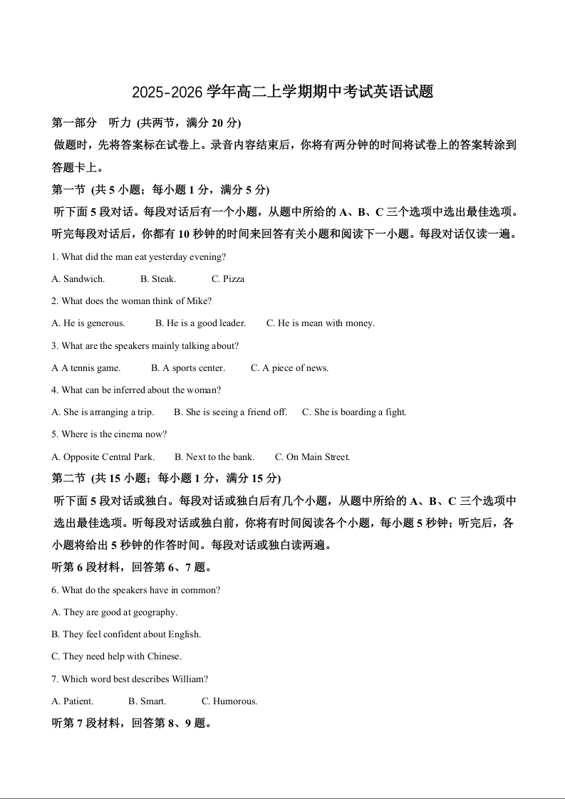 高二英语+答案--河北省沧州市四校2025-2026学年高二上学期期中考试
