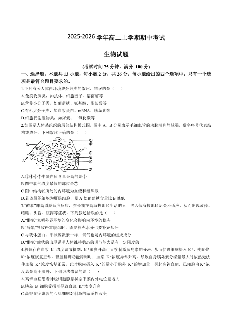 高二生物+答案--河北省沧州市四校2025-2026学年高二上学期期中考试