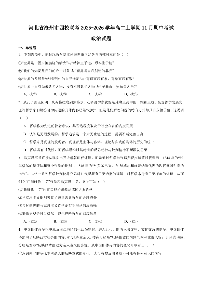 高二政治+答案--河北省沧州市四校2025-2026学年高二上学期期中考试