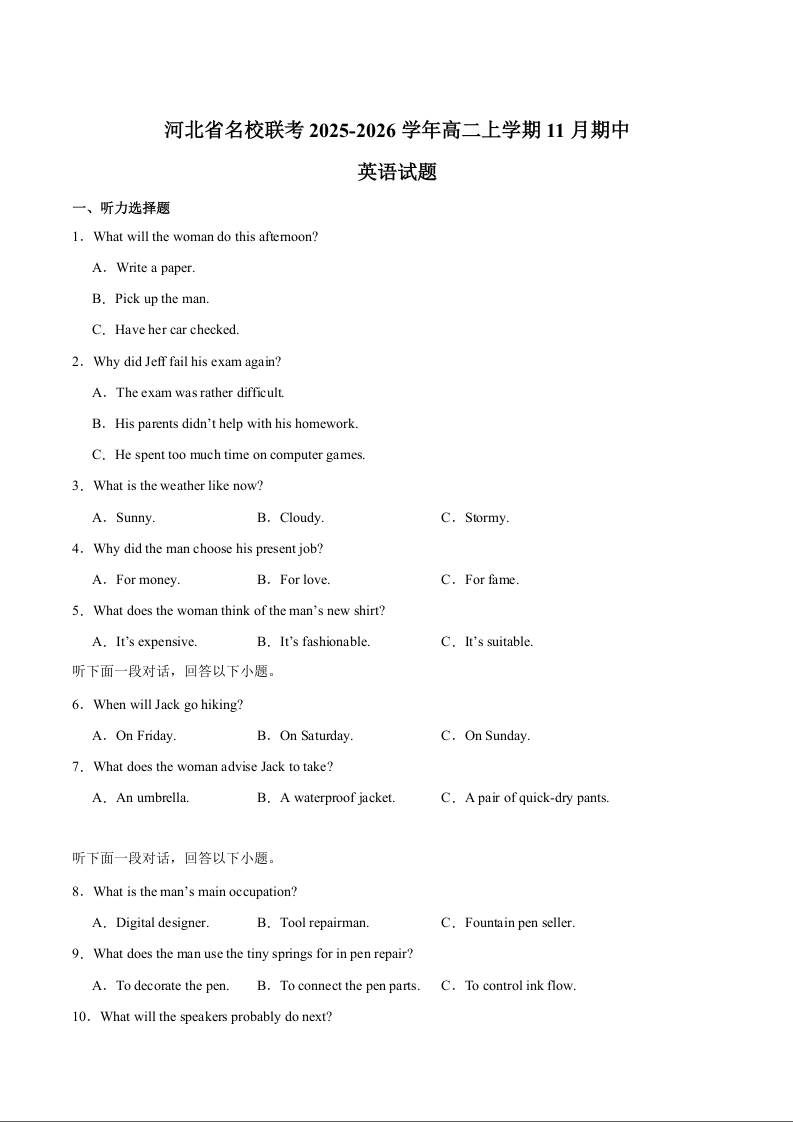 高二英语+答案--河北省名校联考2025-2026学年高二上学期期中考试