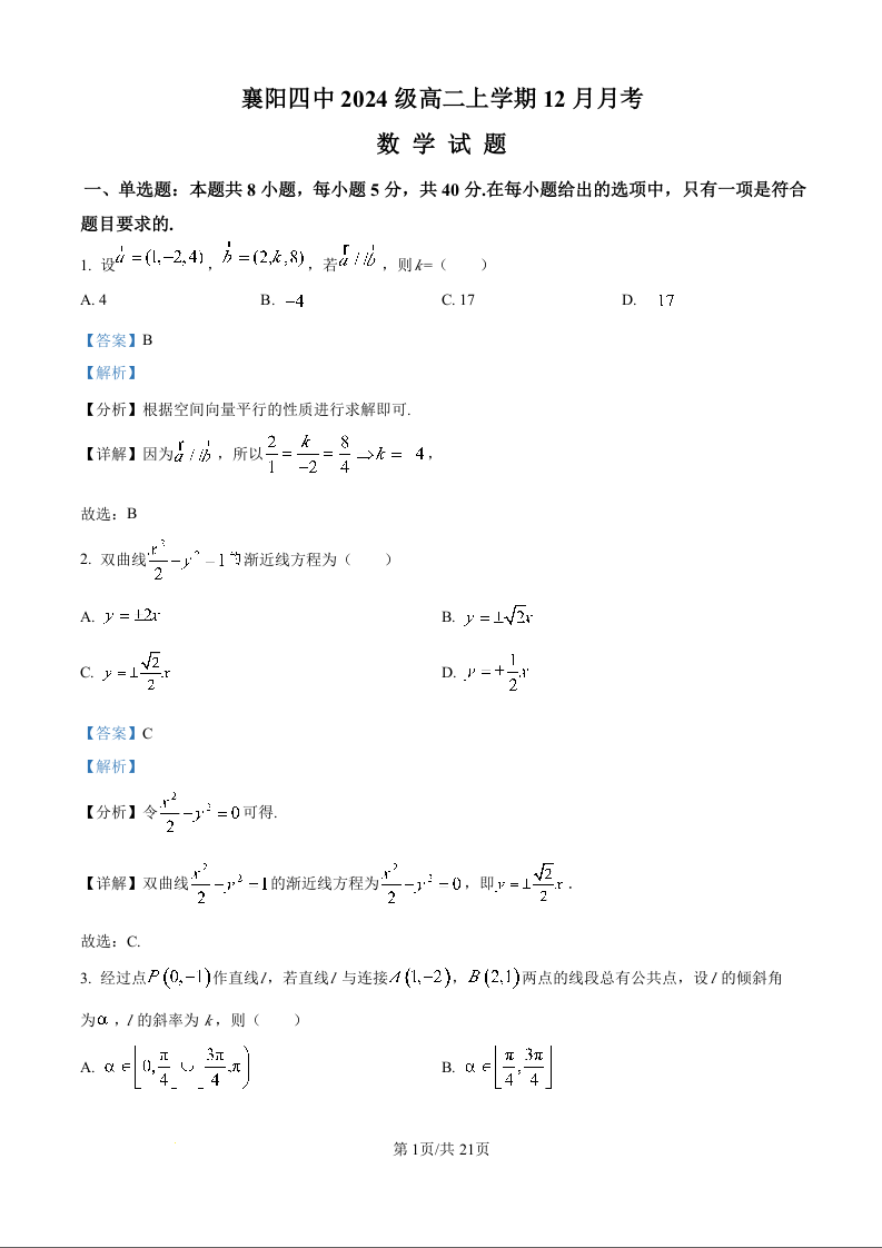 高二数学(精品解析版)--湖北省襄阳市第四中学2025-2026学年高二上学期12月月考