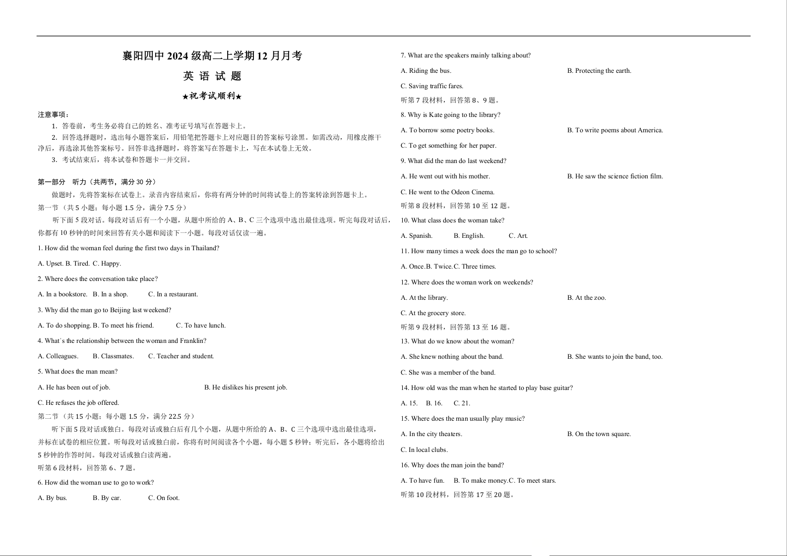 高二英语+答案--湖北省襄阳市第四中学2025-2026学年高二上学期12月月考