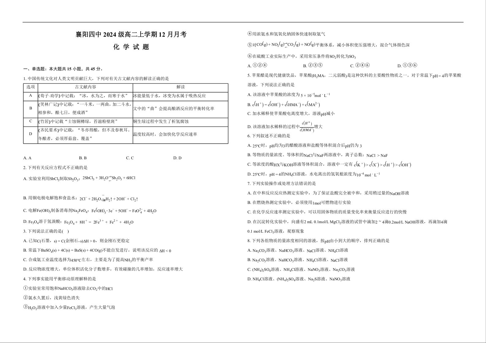 高二化学+答案--湖北省襄阳市第四中学2025-2026学年高二上学期12月月考