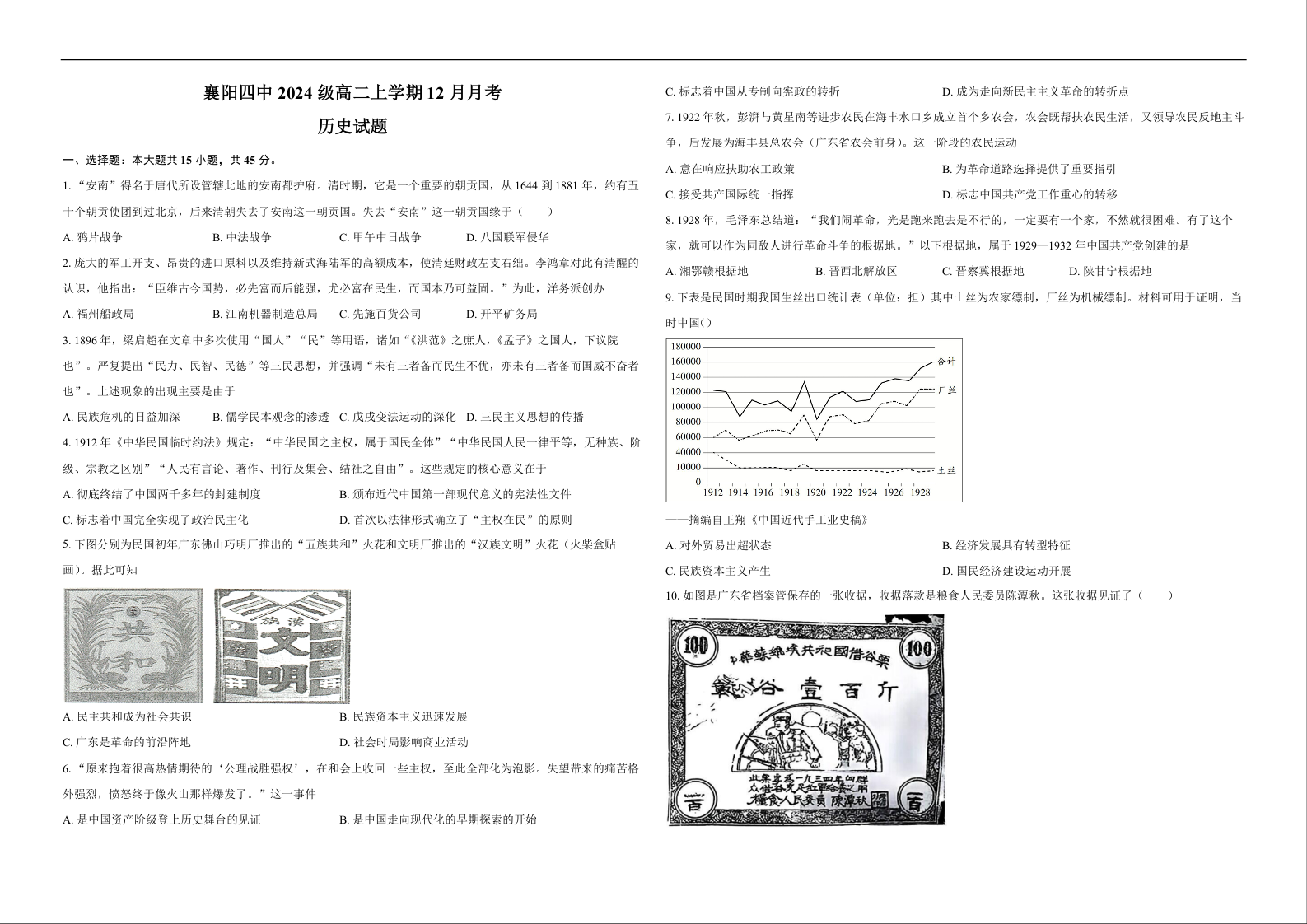 高二历史+答案--湖北省襄阳市第四中学2025-2026学年高二上学期12月月考