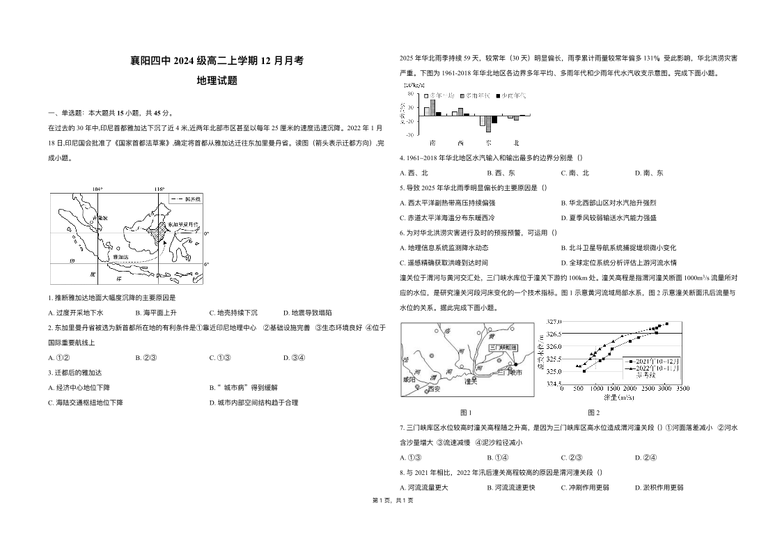 高二地理+答案--湖北省襄阳市第四中学2025-2026学年高二上学期12月月考