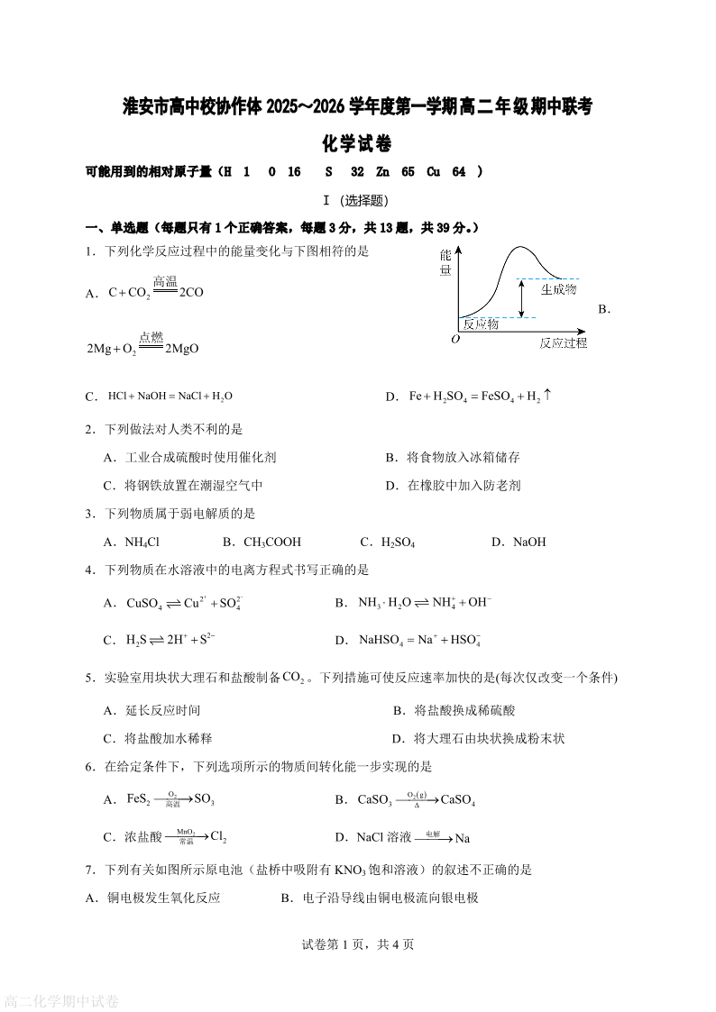 高二化学--江苏省淮安市高中校协作体2025-2026学年高二上学期期中联考