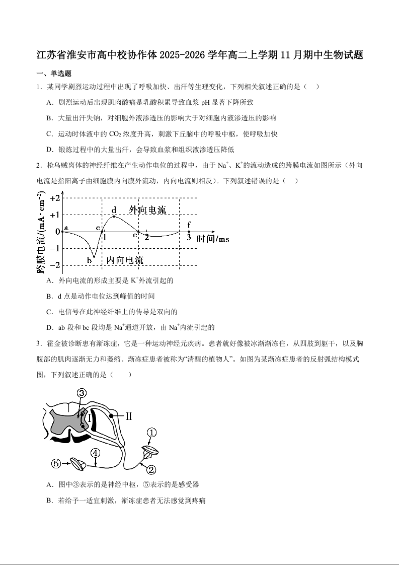 高二生物+答案--江苏省淮安市高中校协作体2025-2026学年高二上学期期中联考