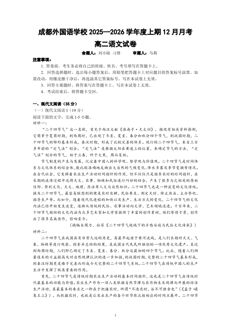 高二语文--四川省成都外国语学校2025-2026学年高二上学期12月月考