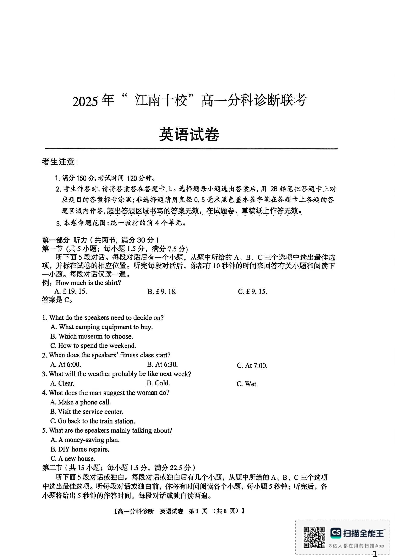 高一英语--安徽省江南十校2025-2026学年高一上学期12月联考