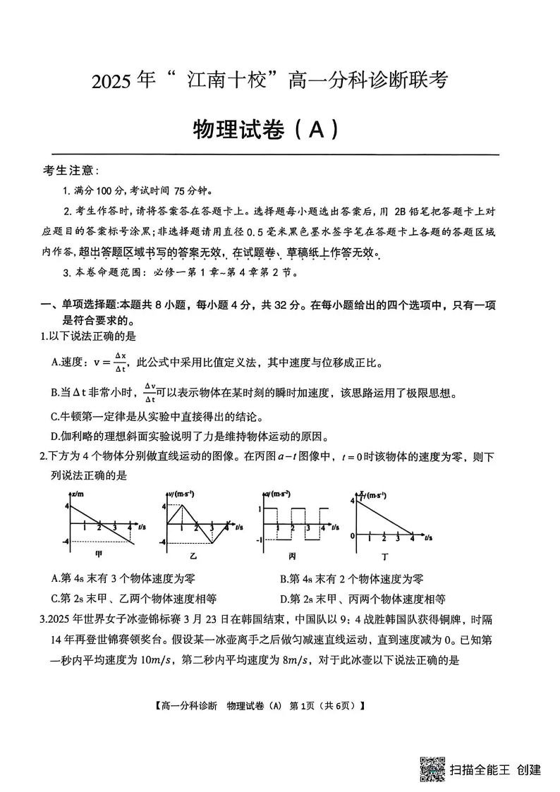 高一物理A--安徽省江南十校2025-2026学年高一上学期12月联考