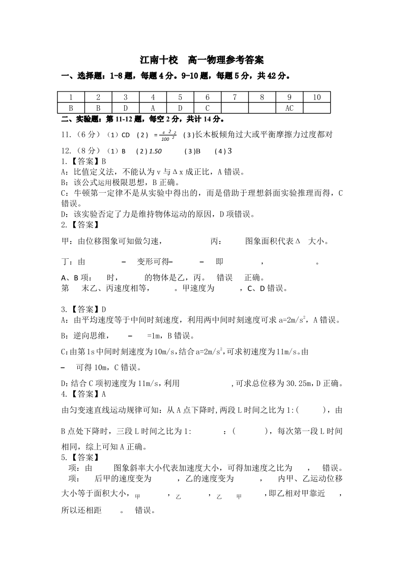 高一物理A答案--安徽省江南十校2025-2026学年高一上学期12月联考