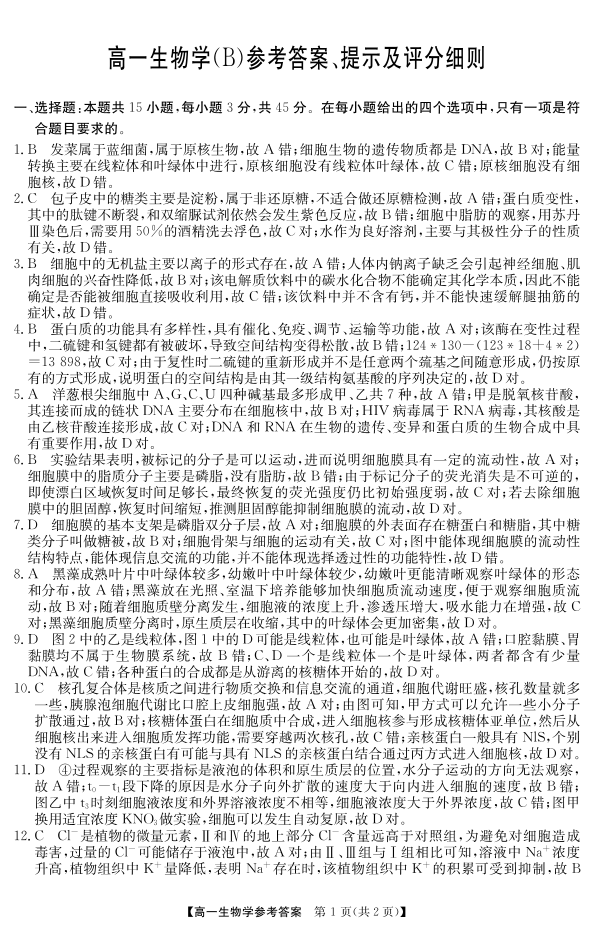 高一生物B答案--安徽省江南十校2025-2026学年高一上学期12月联考