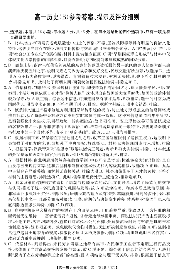 高一历史B答案--安徽省江南十校2025-2026学年高一上学期12月联考