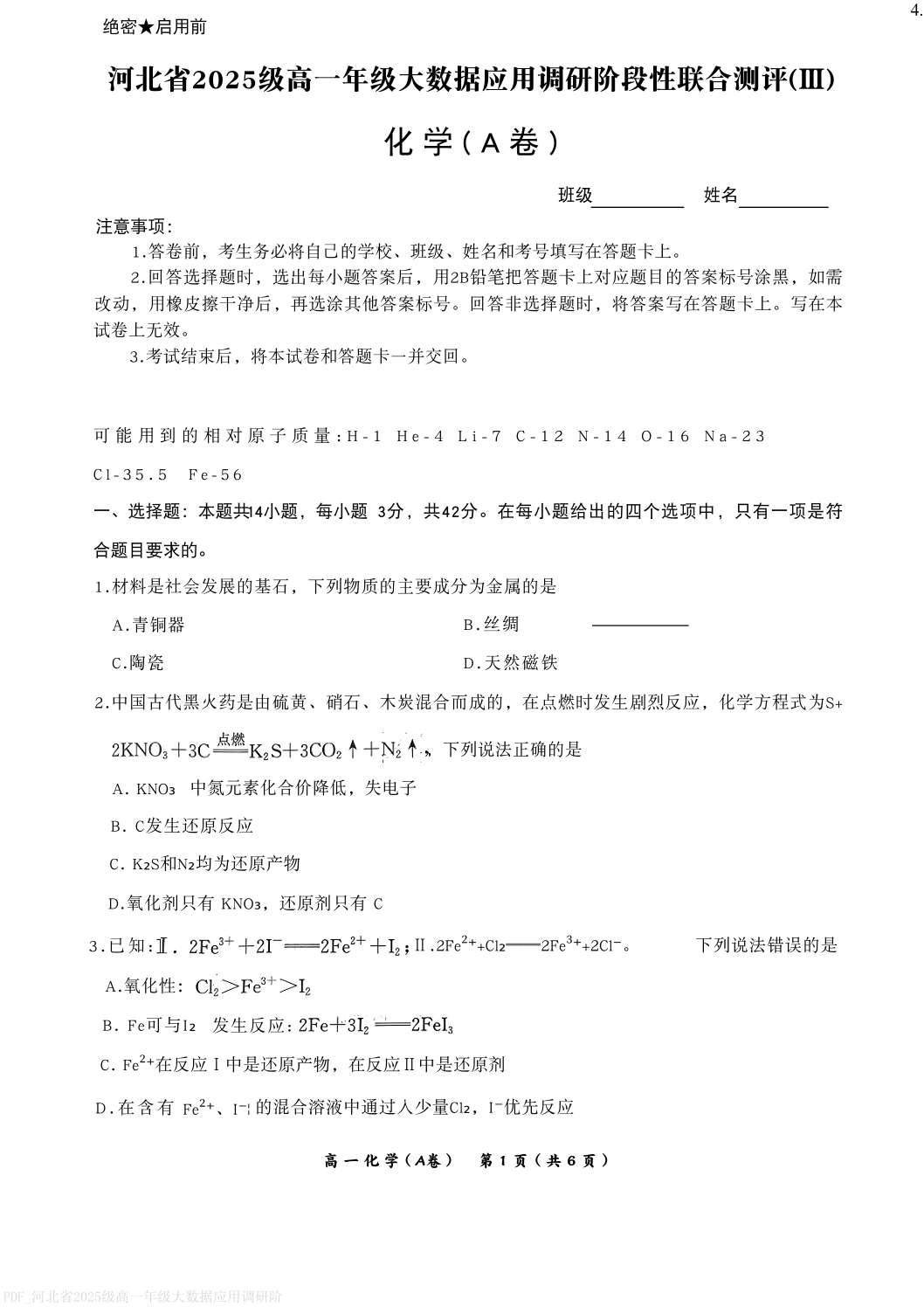 高一化学+答案--河北省2025-2026学年高一上学期大数据应用调研联合测评(Ⅲ)