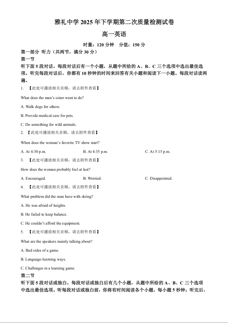 高一英语(原卷版)--湖南省长沙市雅礼中学2025-2026学年高一上学期第二次质量检测
