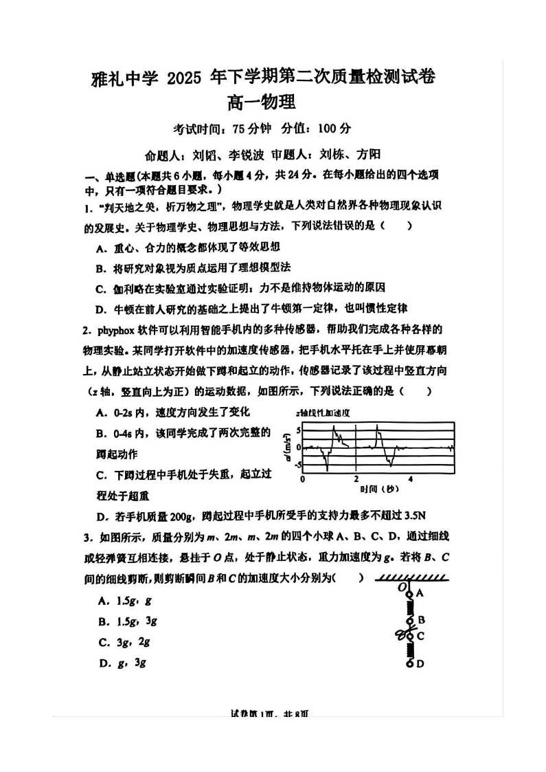 高一物理--湖南省长沙市雅礼中学2025-2026学年高一上学期第二次质量检测