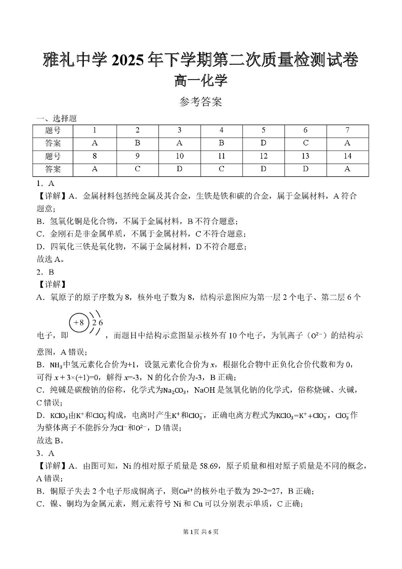 高一化学答案--湖南省长沙市雅礼中学2025-2026学年高一上学期第二次质量检测