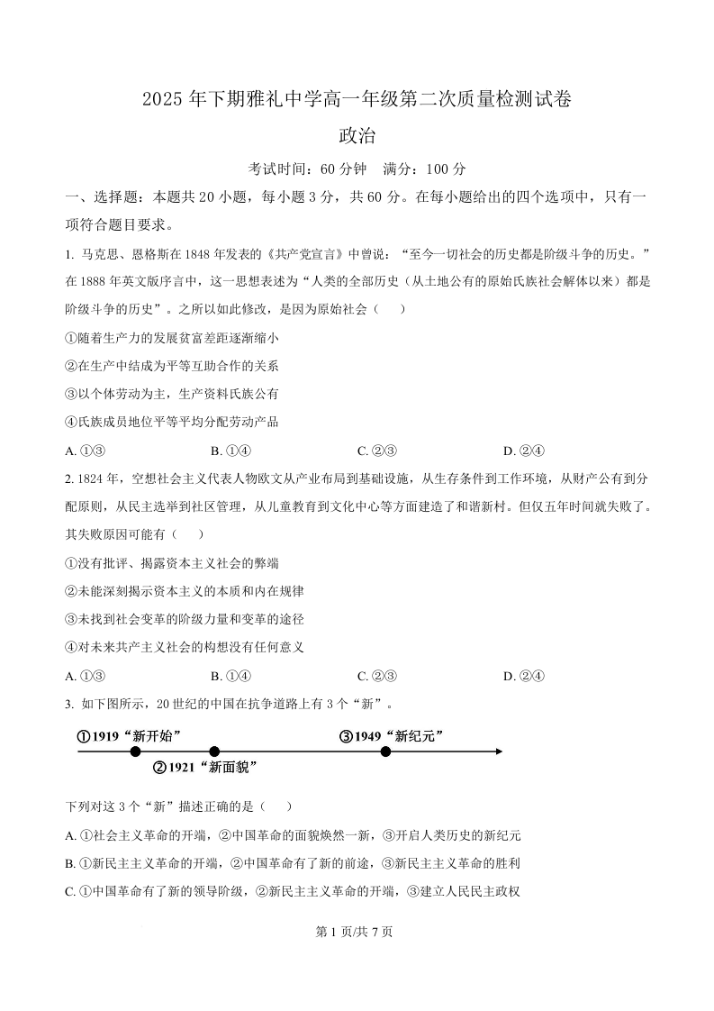 高一政治(原卷版)--湖南省长沙市雅礼中学2025-2026学年高一上学期第二次质量检测