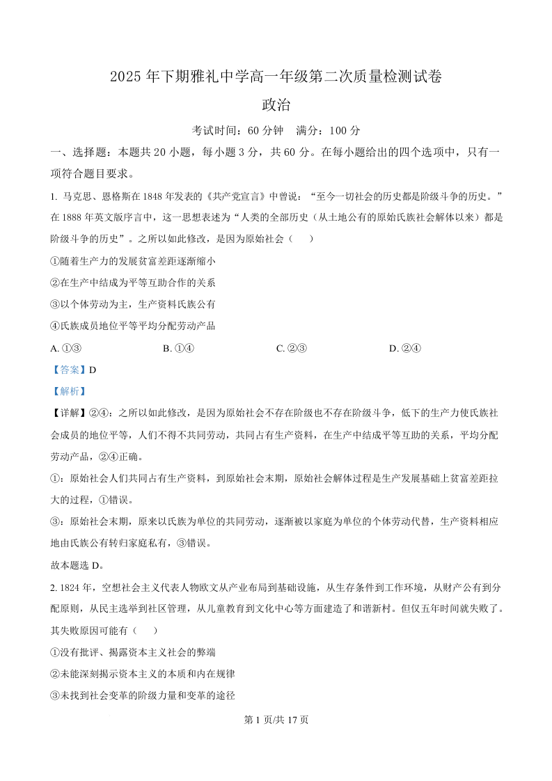 高一政治(解析版)--湖南省长沙市雅礼中学2025-2026学年高一上学期第二次质量检测