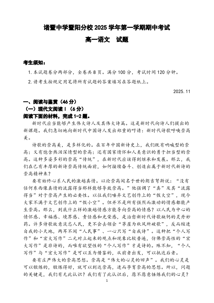 高一语文--浙江省诸暨中学暨阳分校2025-2026学年高一上学期期中考试