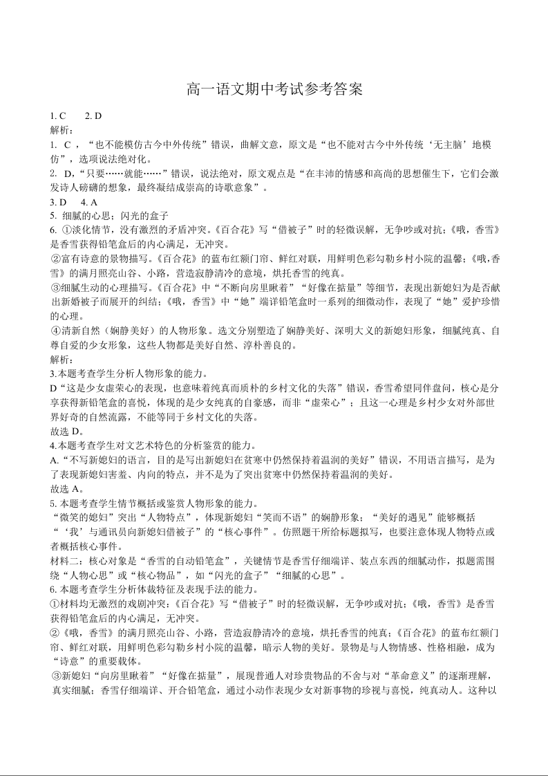 高一语文答案--浙江省诸暨中学暨阳分校2025-2026学年高一上学期期中考试