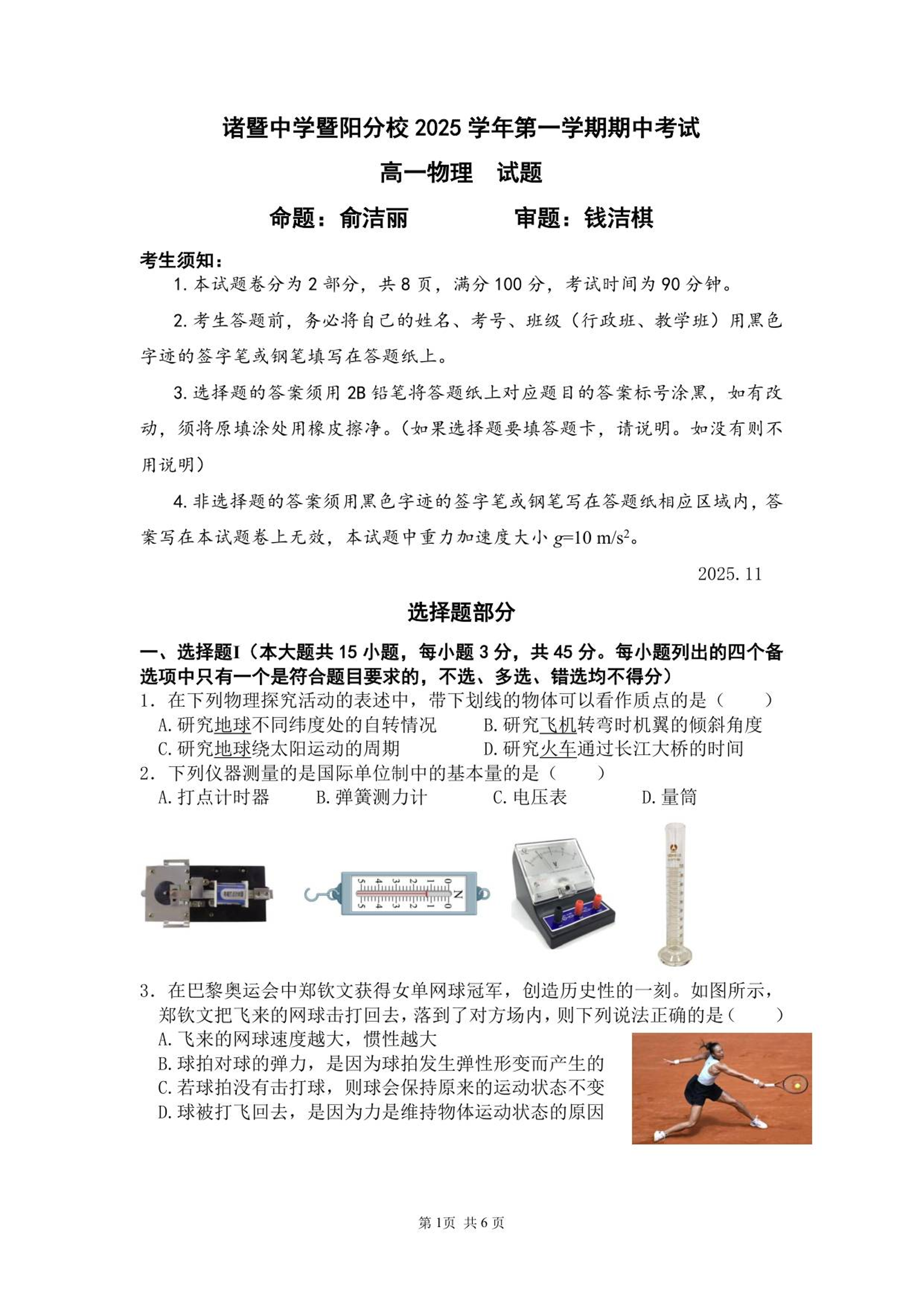 高一物理--浙江省诸暨中学暨阳分校2025-2026学年高一上学期期中考试