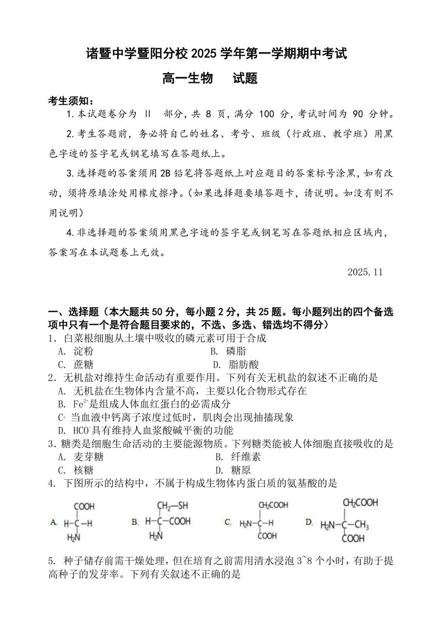 高一生物--浙江省诸暨中学暨阳分校2025-2026学年高一上学期期中考试