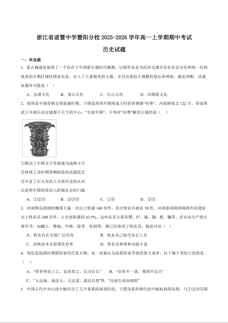 高一历史+答案--浙江省诸暨中学暨阳分校2025-2026学年高一上学期期中考试