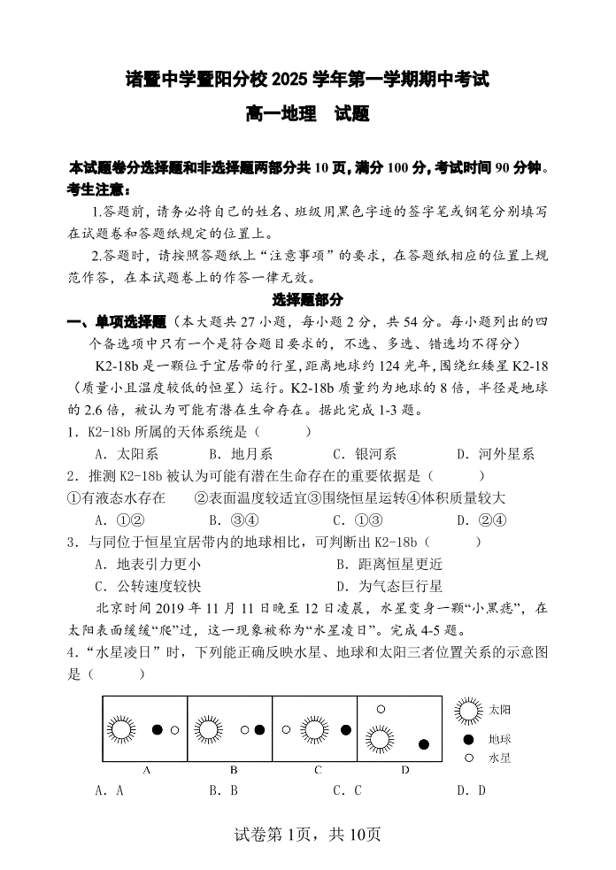 高一地理--浙江省诸暨中学暨阳分校2025-2026学年高一上学期期中考试
