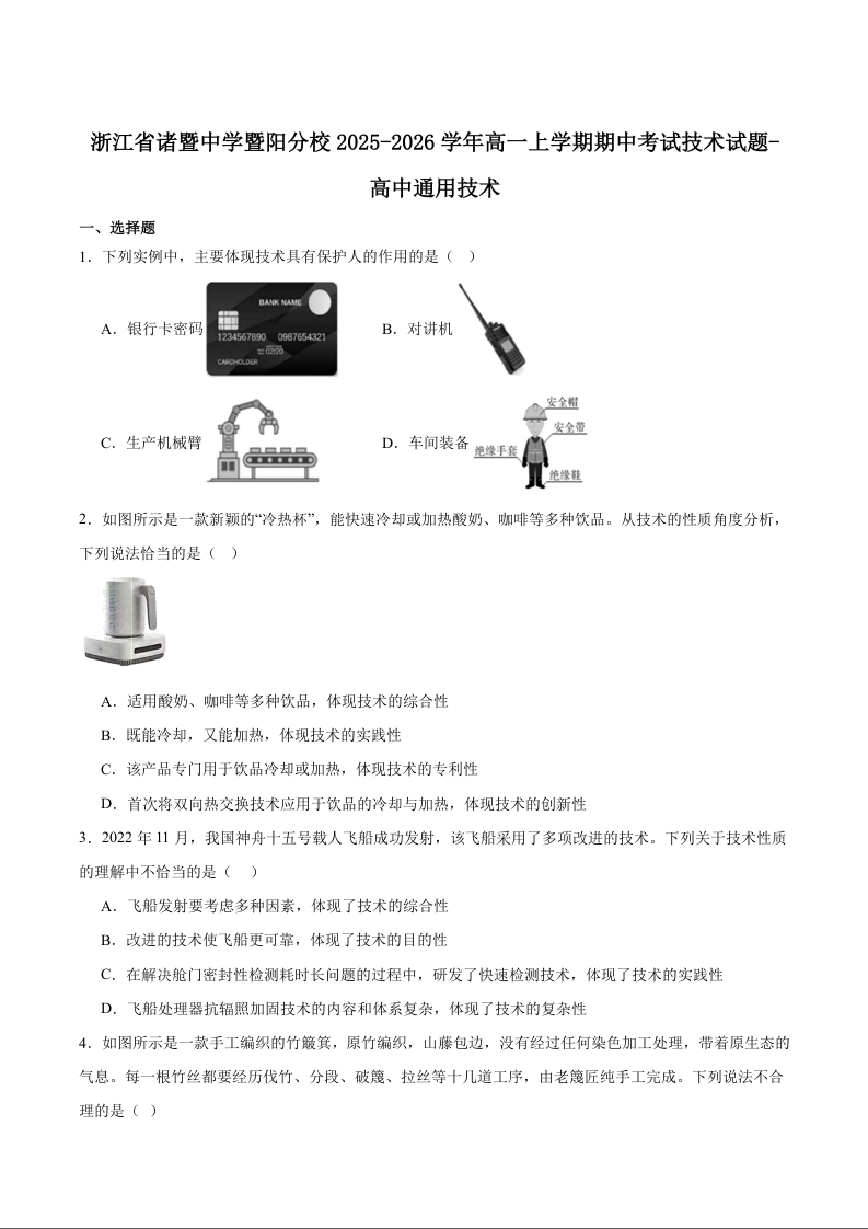 高一通用技术+答案--浙江省诸暨中学暨阳分校2025-2026学年高一上学期期中考试