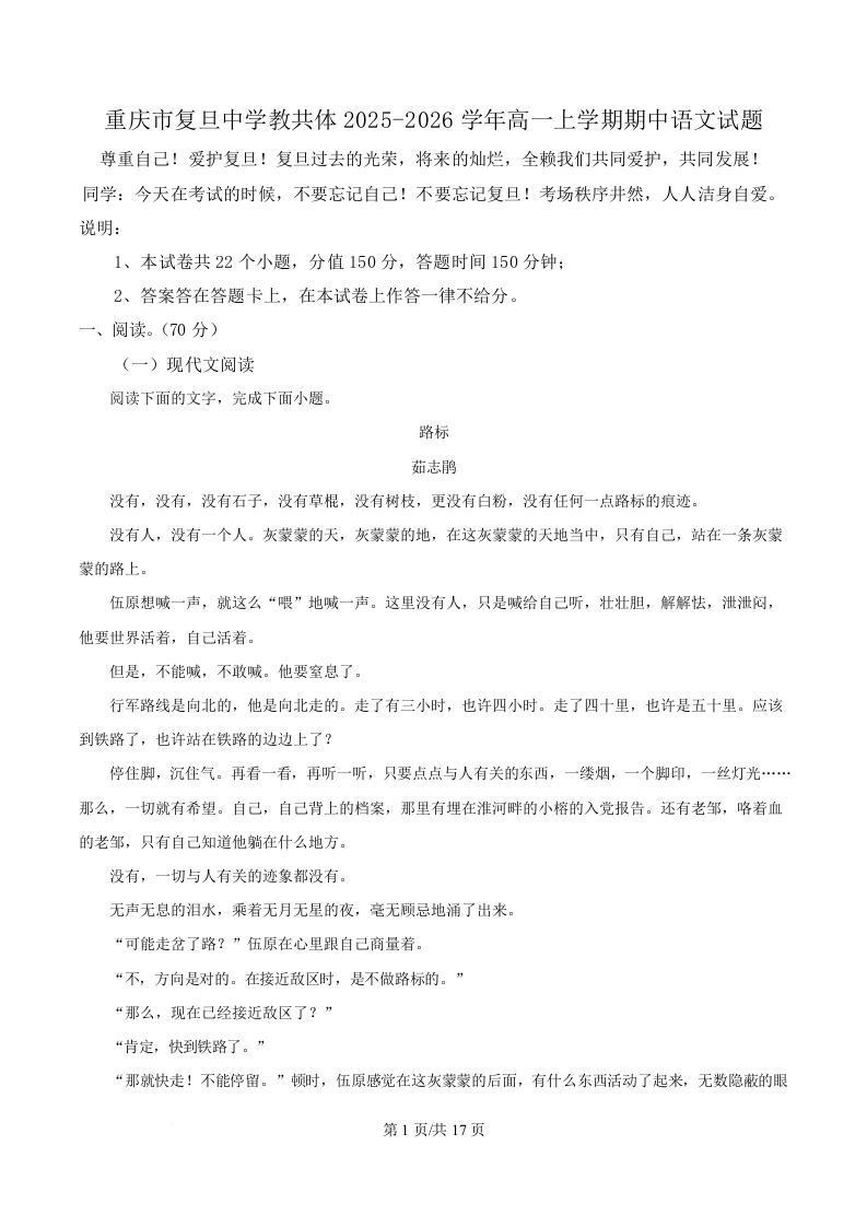 高一语文(解析版)--重庆市复旦中学教共体2025-2026学年高一上学期第二次段考