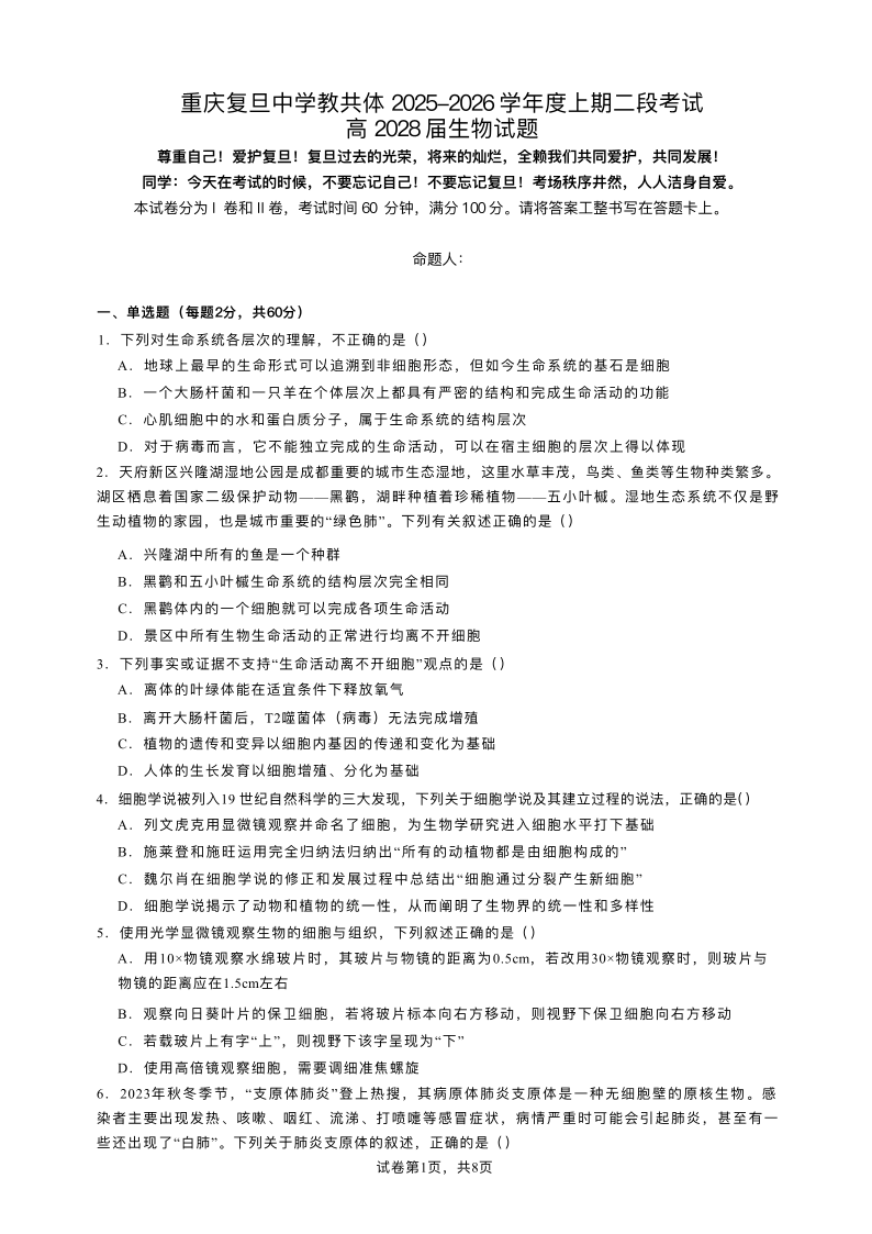 高一生物+答案--重庆市复旦中学教共体2025-2026学年高一上学期第二次段考