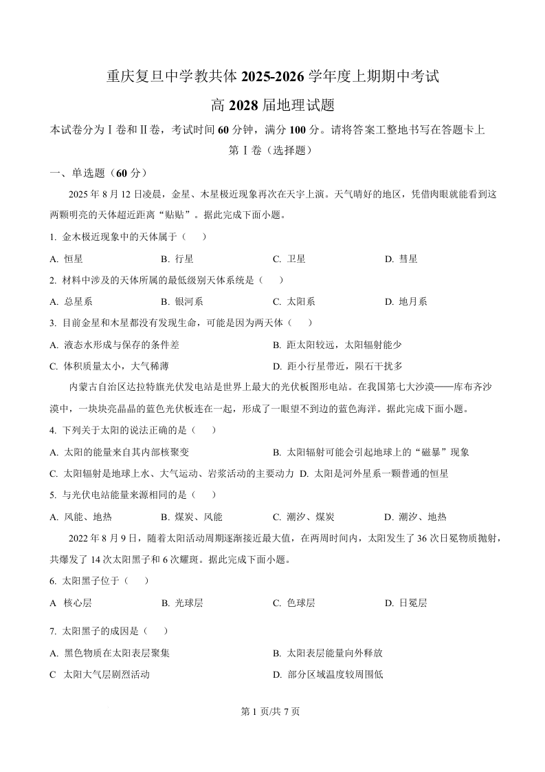 高一地理(原卷版)--重庆市复旦中学教共体2025-2026学年高一上学期第二次段考