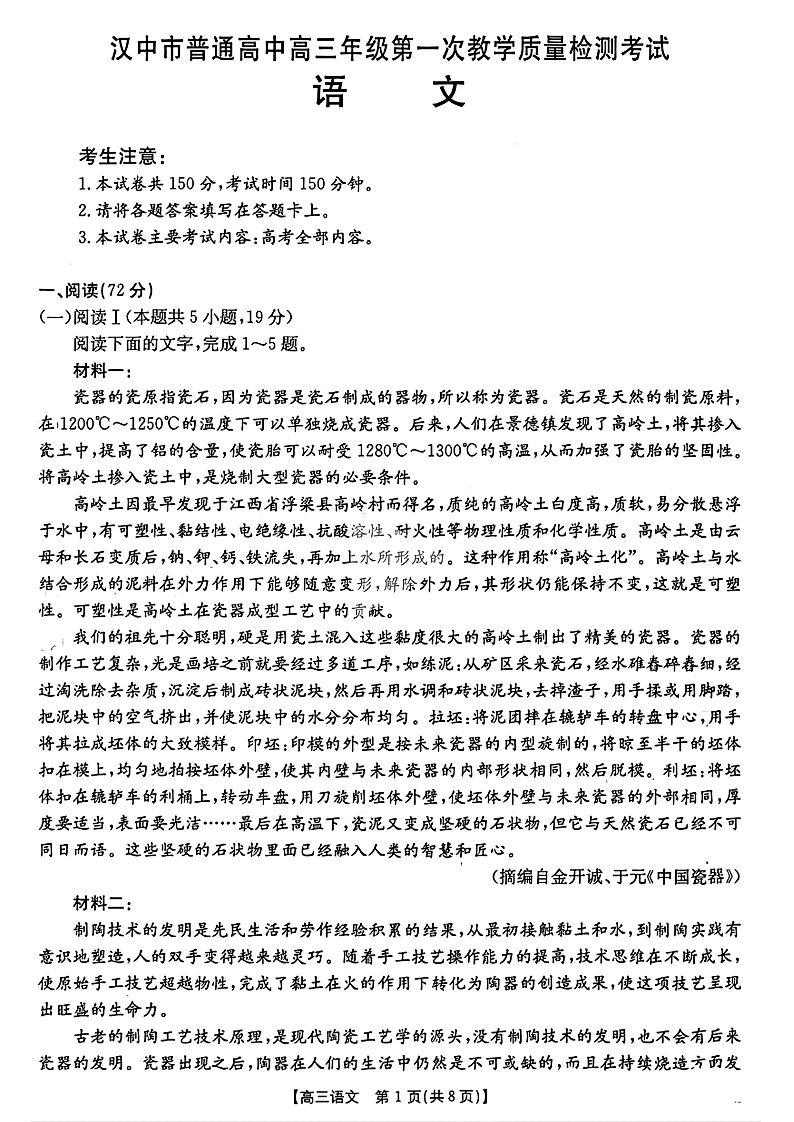高三语文+答案--陕西省汉中市2026届高三第一次教学质量检测考试(汉中一模)
