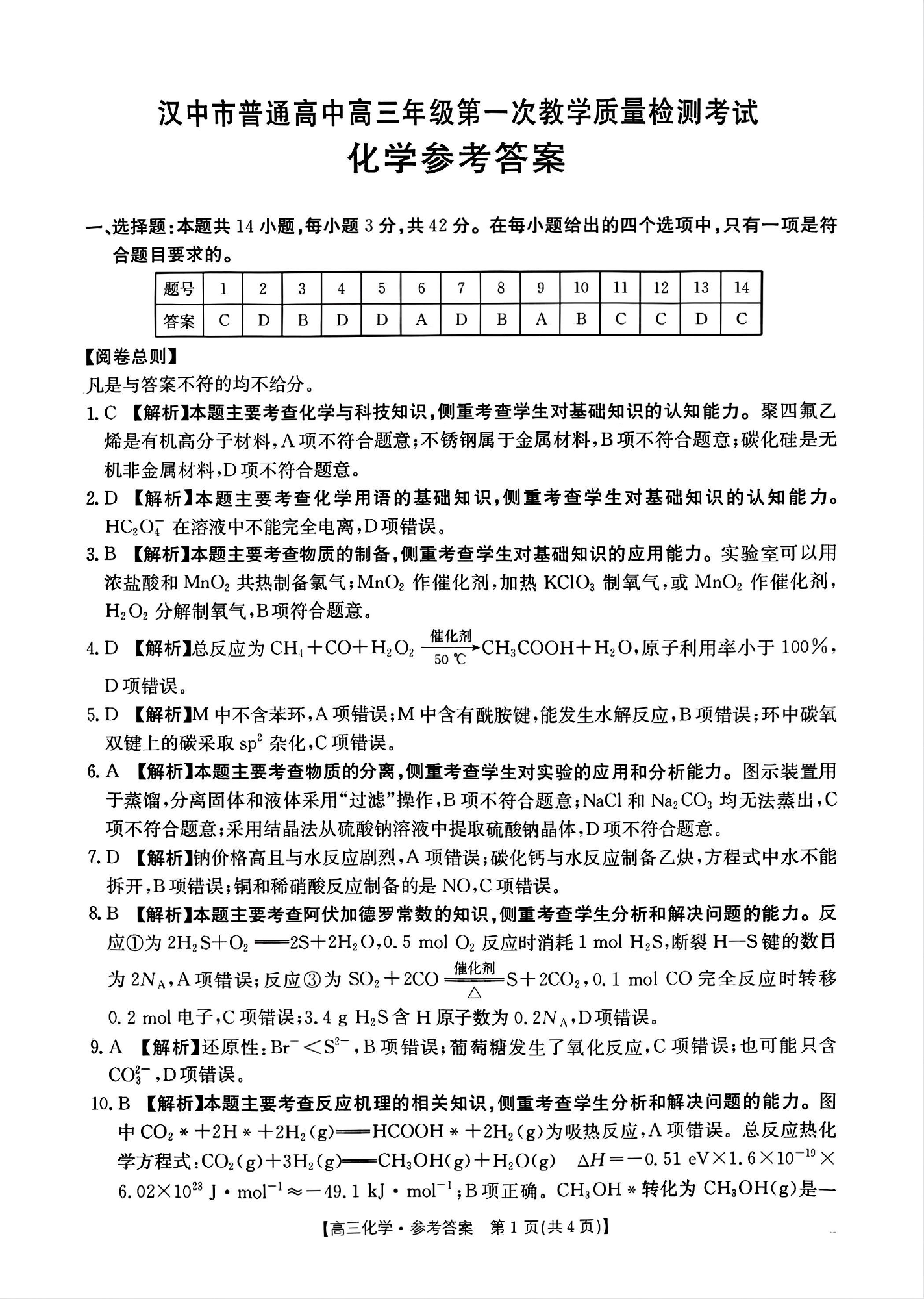 高三化学答案--陕西省汉中市2026届高三第一次教学质量检测考试(汉中一模)