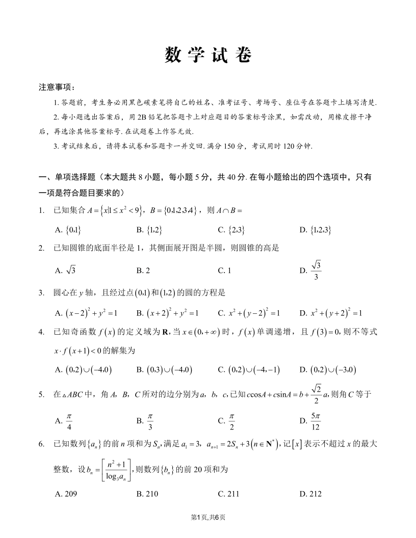 高三数学--重庆市巴蜀中学2026届高考适应性月考卷(五)