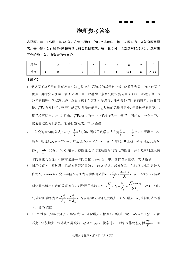 高三物理答案--重庆市巴蜀中学2026届高考适应性月考卷(五)