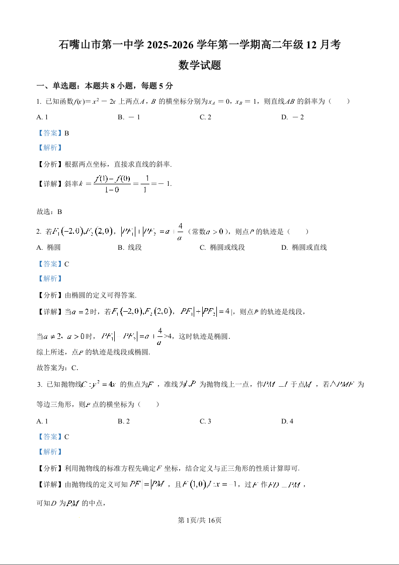 高二数学(精品解析版)--宁夏回族自治区石嘴山市第一中学2025-2026学年高二上学期12月月考