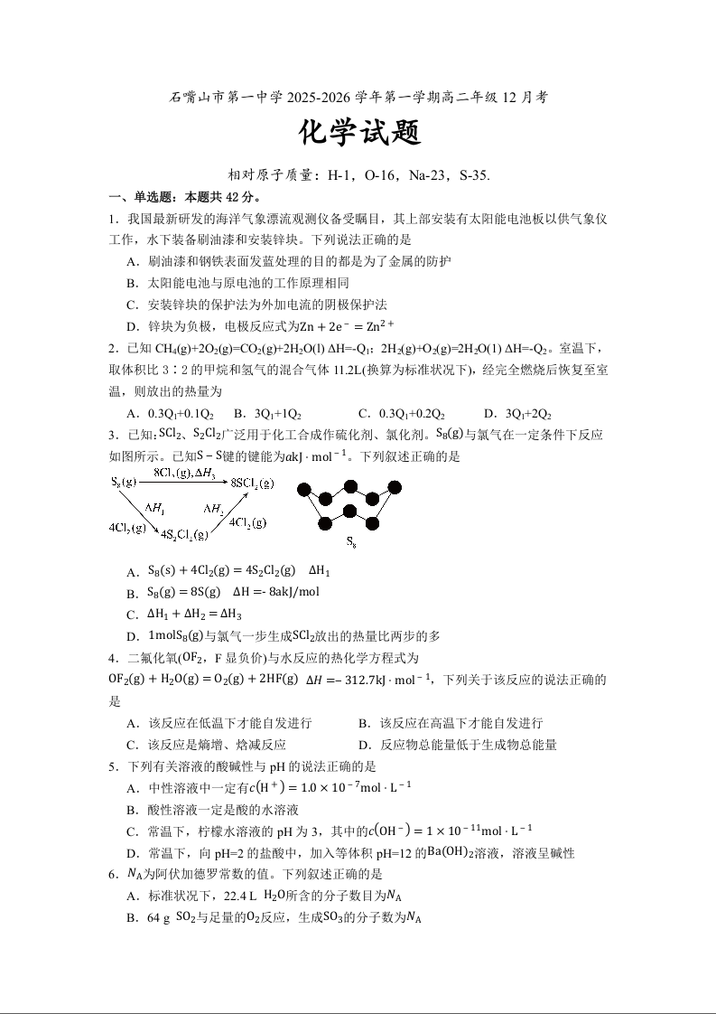高二化学--宁夏回族自治区石嘴山市第一中学2025-2026学年高二上学期12月月考