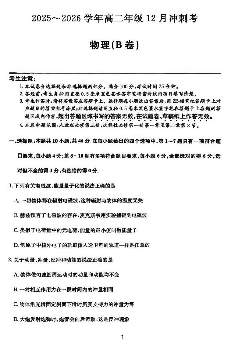 高二物理--山西省三晋卓越联盟2025-2026学年高二12月冲刺卷