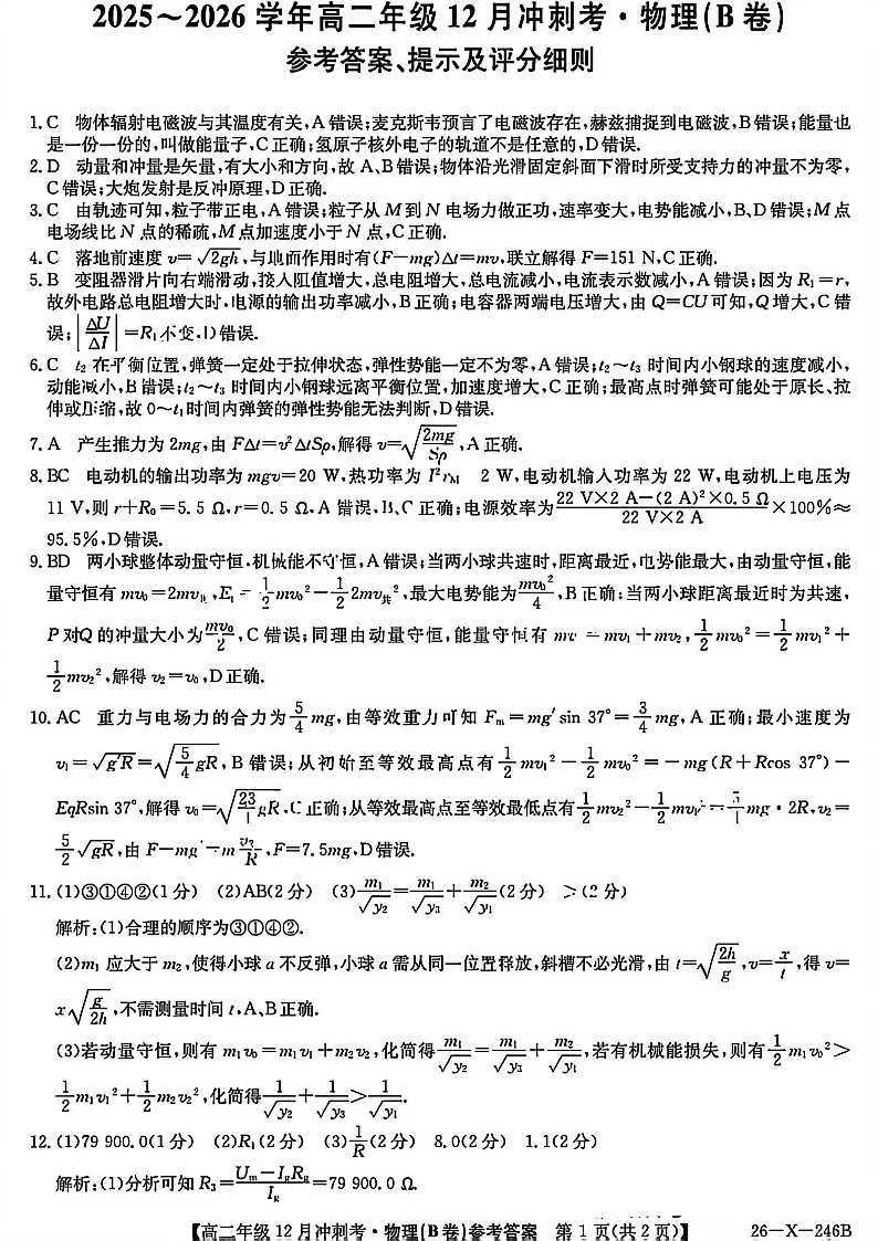 高二物理答案--山西省三晋卓越联盟2025-2026学年高二12月冲刺卷