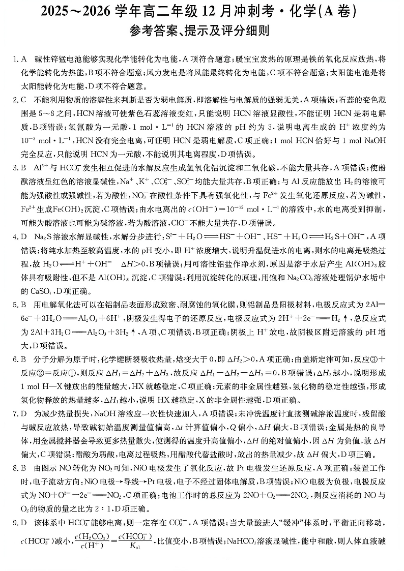 高二化学答案--山西省三晋卓越联盟2025-2026学年高二12月冲刺卷