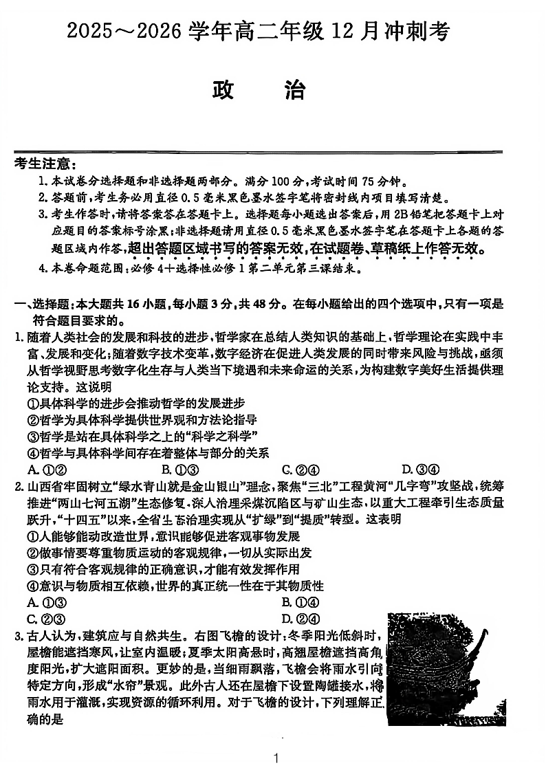 高二政治--山西省三晋卓越联盟2025-2026学年高二12月冲刺卷