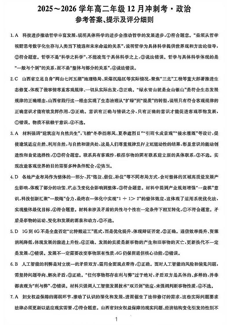 高二政治答案--山西省三晋卓越联盟2025-2026学年高二12月冲刺卷