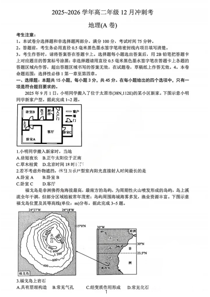 高二地理--山西省三晋卓越联盟2025-2026学年高二12月冲刺卷